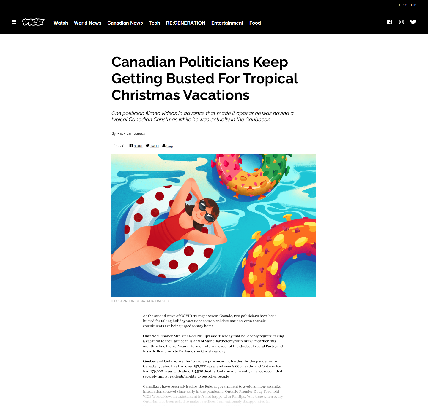 This editorial illustration accompanies an article in VICE News that exposes the hypocrisy of Canadian politicians, who should be setting an example for their country, and instead chose to ignore public health orders in favour of their own self interest.